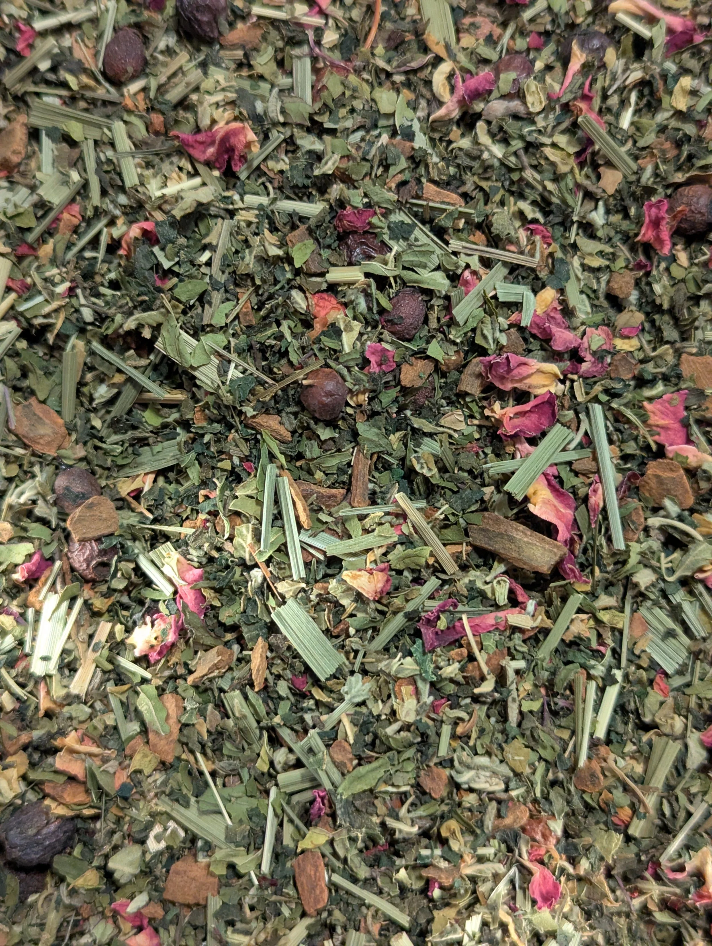 Organic Ingredients: Hawthorne berries, sweet cinnamon, stinging nettle, damiana, peppermint, lemongrass, reishi mushroom, rose.